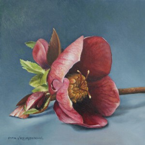 2021Bloem van de Helleborus liggend op blauwe ondergrond Info: Kunstatelier Pita, Emst www.pitavreugdenhil.nl