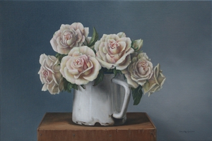 2021Stilleven met witte rozen in een emaille kan op een houten sokkel Info: Kunstatelier Pita, Emst www.pitavreugdenhil.nl