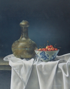 2021Stilleven met bronzen wespenvanger en schaaltje spekkersen op een witte servet Info: Kunstatelier Pita, Emst www.pitavreugdenhil.nl